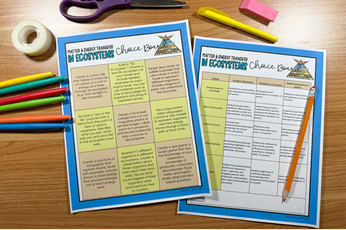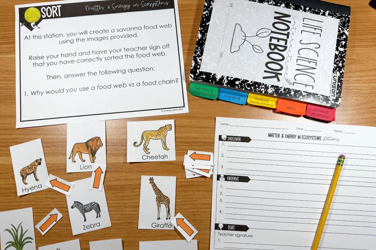 Matter and energy transfer in ecosystems help students understand how energy flows through living systems. In these middle school ecosystem lessons, students explore food chains, food webs, energy pyramids, producers, consumers, and decomposers. These energy flow activities for middle school include hands-on models and investigations that help students visualize how energy moves through ecosystems and why it decreases at each level.